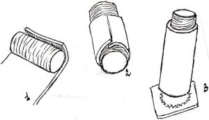 Donnez à la croûte la forme d’un rectangle dont l’un des côtés aura la dimension de la hauteur du cylindre. Enroulez la plaque autour d’un tube de carton (fig.1). Une feuille de journal intercalée entre la pâte et le tube empêchera toute adhérence et permettra un démoulage facile.