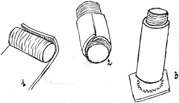 Les 2 extrémités de la plaque rectangulaire doivent se superposer sur 1 ou 2 cm. (fig.2). Amincissez cette zone de superposition de la moitié de son épaisseur afin qu’au final elle n’offre plus de renflement important. Guillochez les bords, enduisez-les généreusement de barbotine et joignez les 2 parties solidement à l’ébauchoir . L’excès de barbotine doit apparaître.