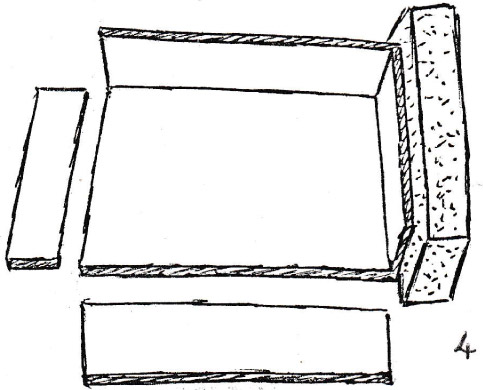 Par exemple, un volume parallélépipédique. Taillez dans une croûte un fond et 4 côtés selon vos dimensions dessinées sur une feuille cartonnée. Placez le fond de la boite sur un rectangle de papier journal, lui même sur une planchette de bois. Guillochez et barbotinez les surfaces qui seront en contact et disposez sur chant un premier côté adossé contre une brique (fig.4).